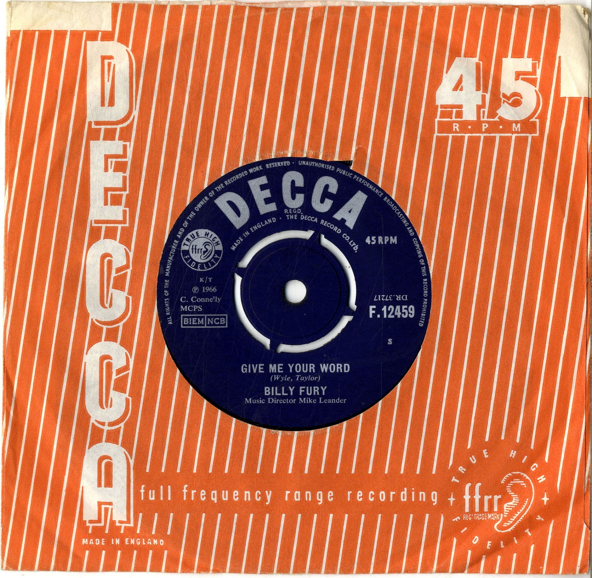 Billy Fury - Give Me Your Word/She's So Far Out She's In (F 12459) Ex