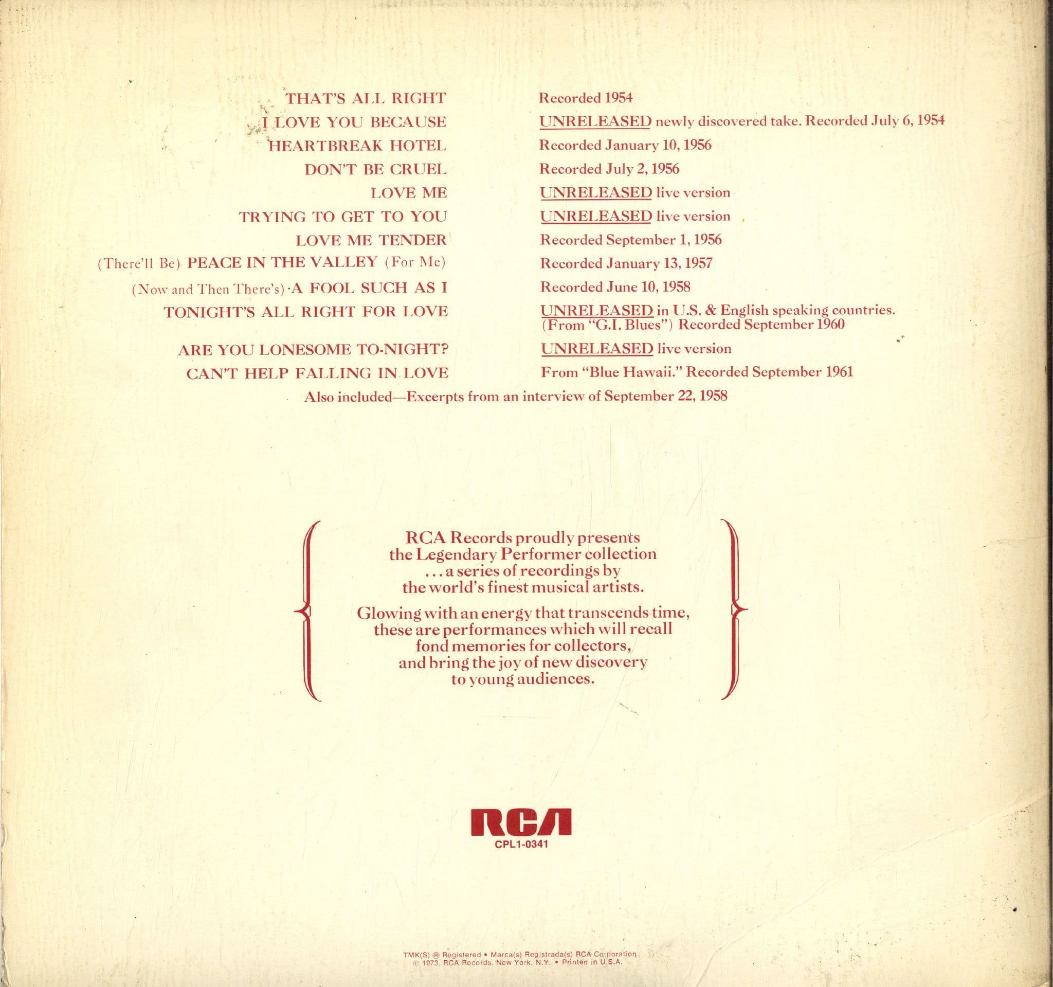 Elvis Presley - A Legendary Performer Vol. 1 (CPL1 0341) With Booklet