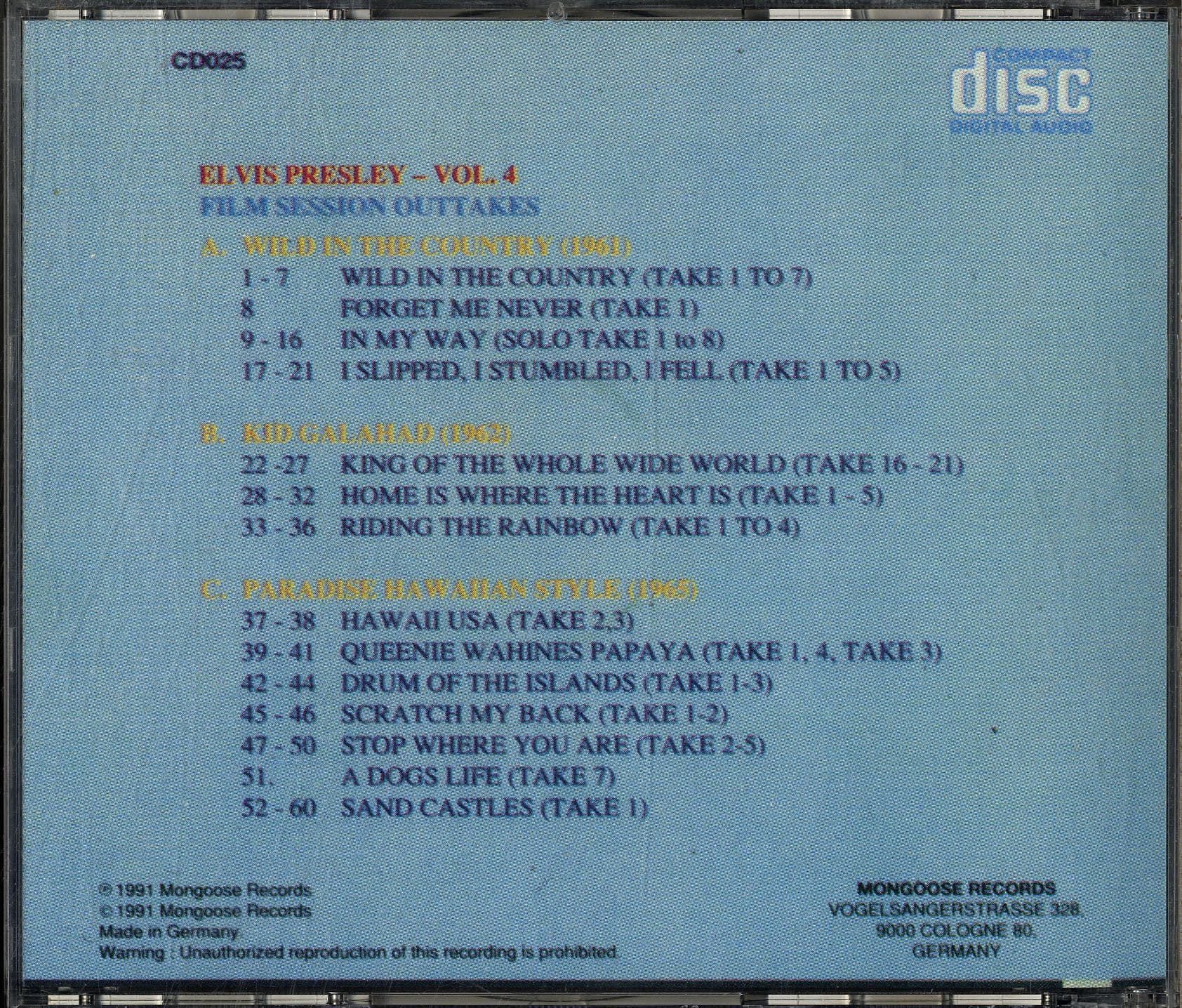 Elvis Presley - Film Session Outtakes - Mongoose CD
