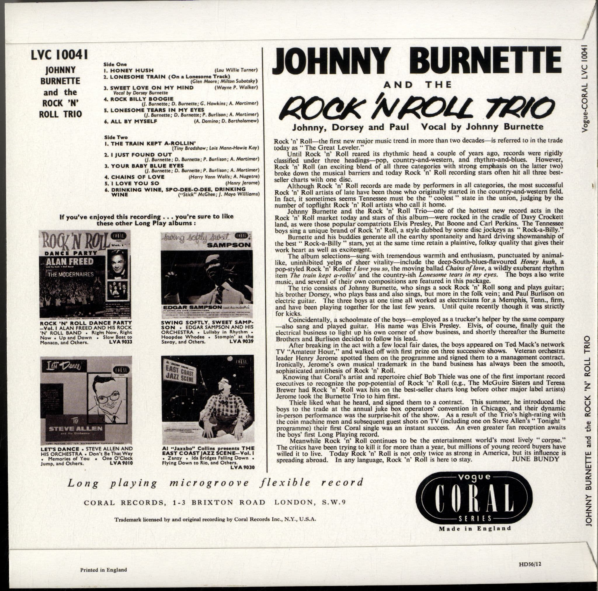 Johnny Burnette - And The Rock 'n' Roll (LVC 10041) 10" LP - Turquoise Vinyl - As New