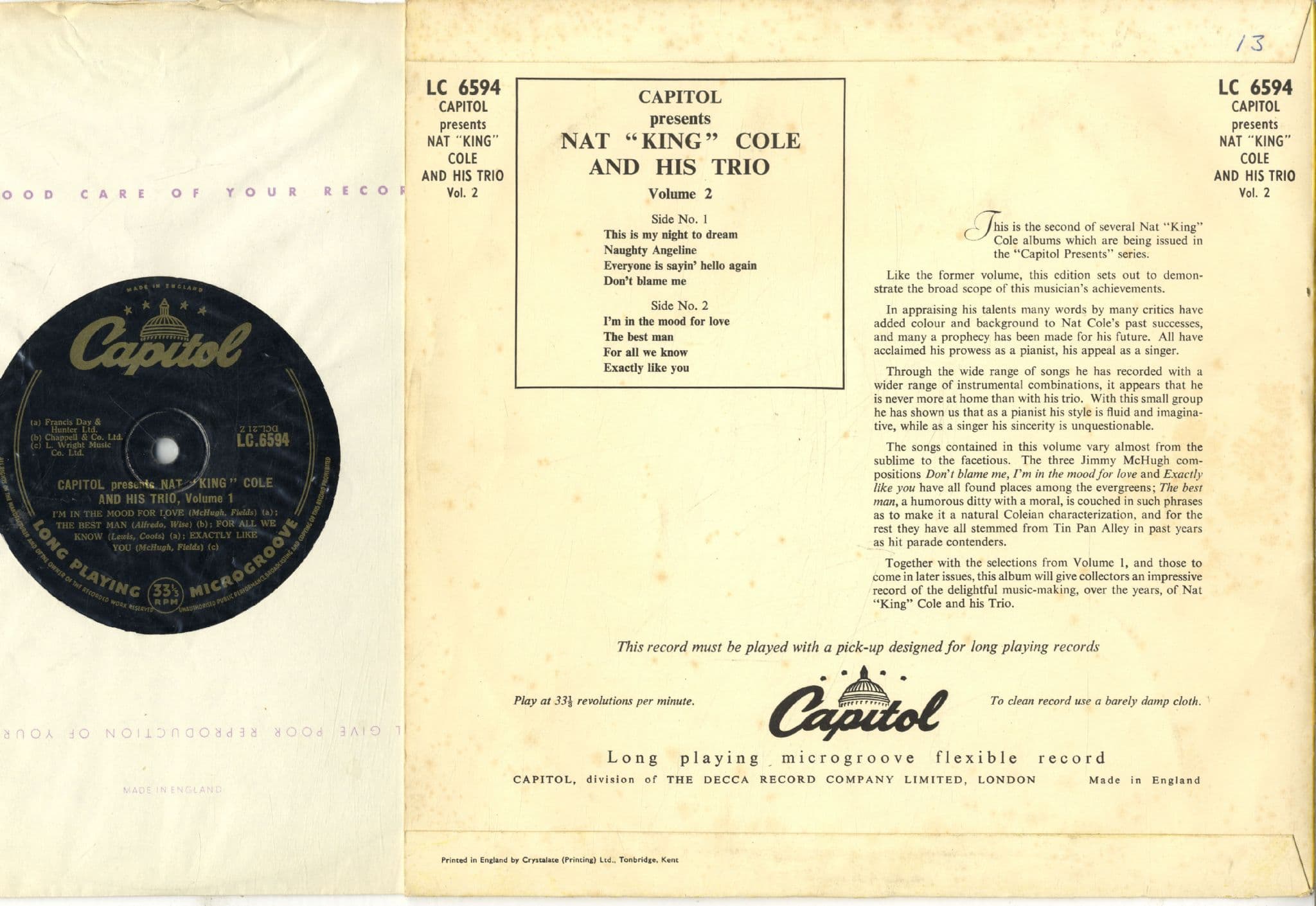 Nat King Cole and His Trio - Capitol Presents .. (LC 6594) 10" LP - Ex/Ex
